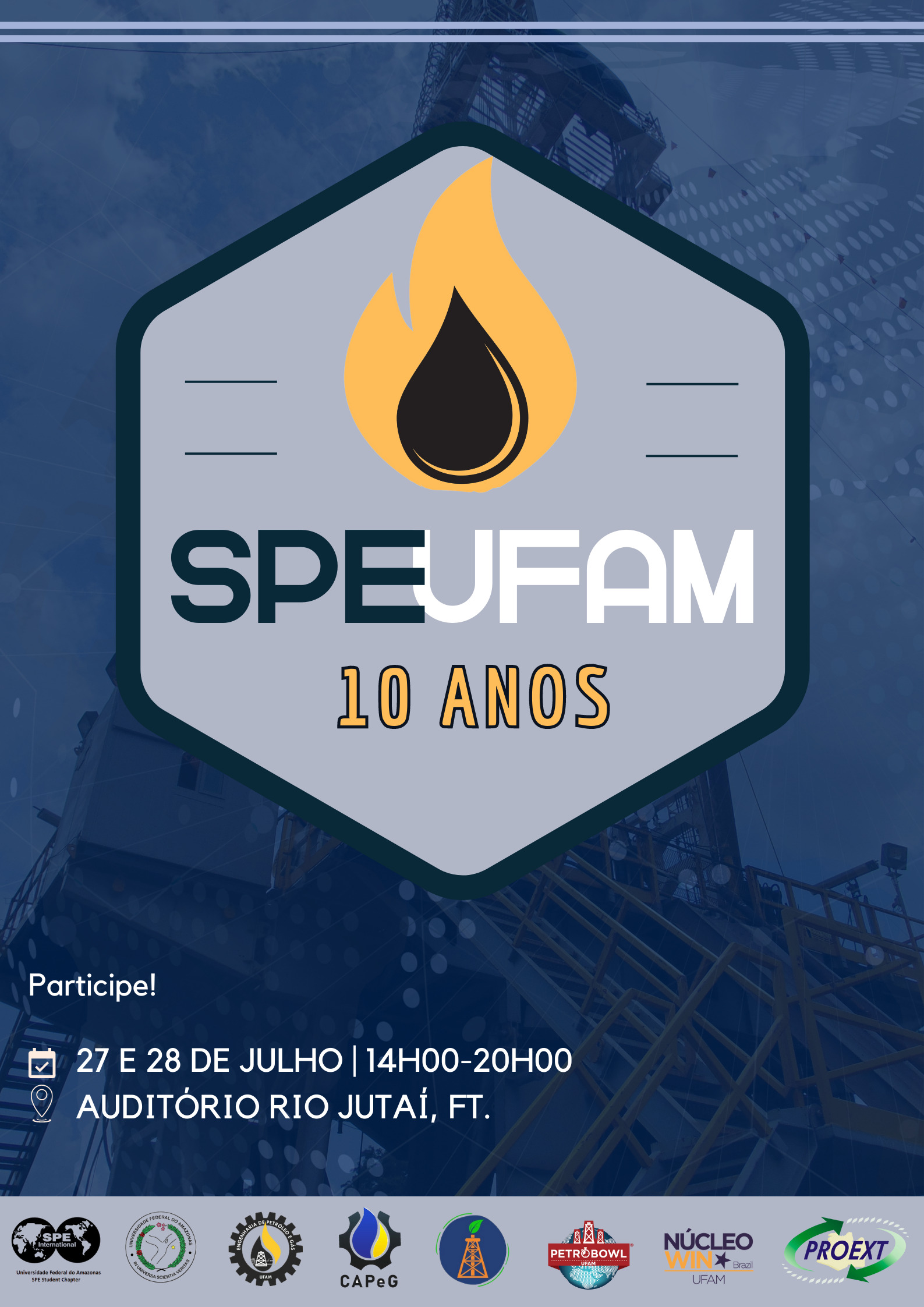 Professores e alunos do Curso de Engenharia de Petróleo e Gás, da Faculdade de Tecnologia, e a Society of Petroleum Engineers (SPE) realizam nos dias 27 e 28 de julho, no Auditório Rio Jutaí da FT, evento em comemoração aos 10 anos da SPE-Ufam, que é um capítulo da SPE que reúne alunos de graduação em Engenharia de Petróleo e Gás da Ufam.
