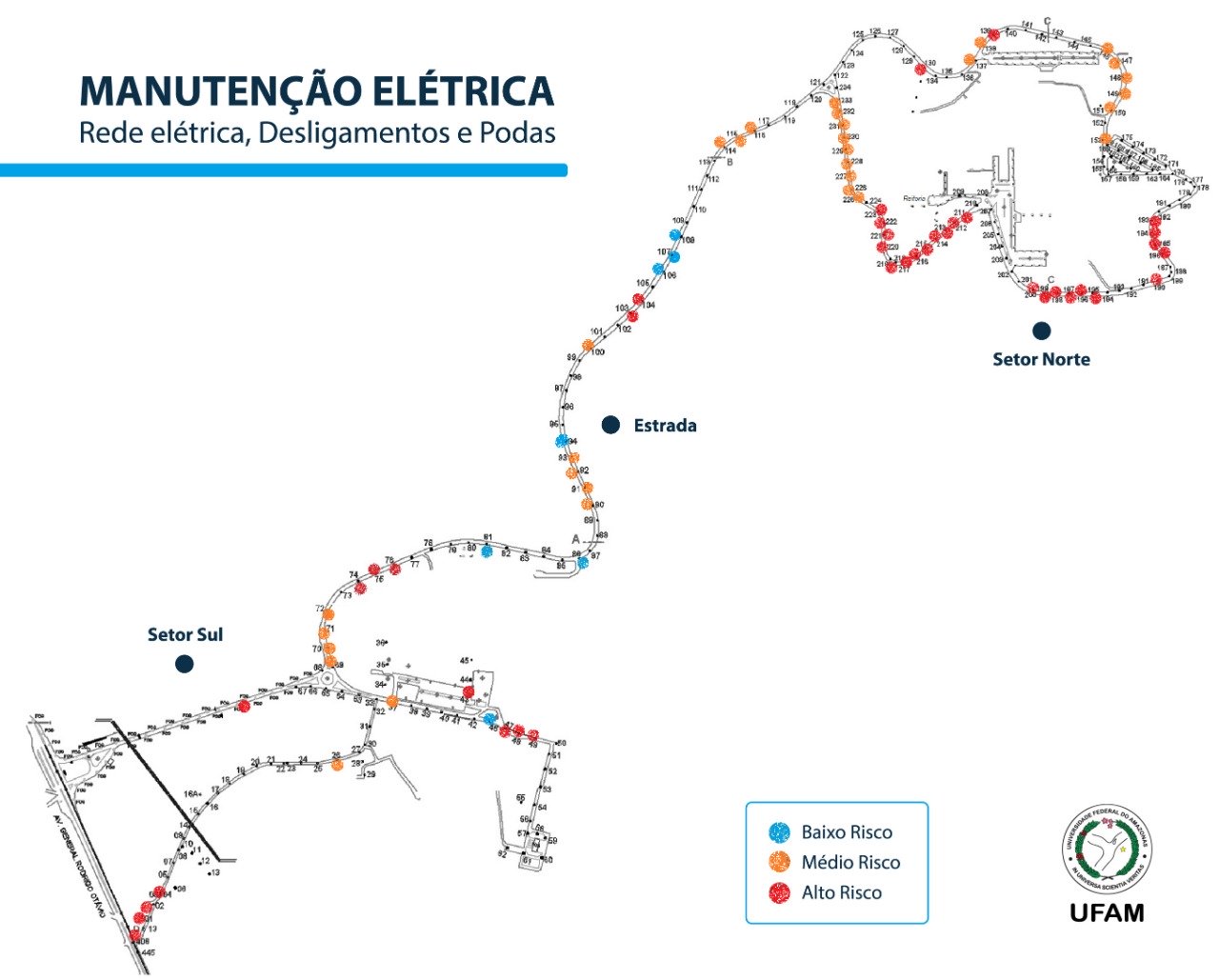 A Prefeitura do Campus Universitário (PCU) informa à comunidade acadêmica que nos dias 26 e 31 de julho, e 8 de agosto, no horário de 14h as 17h, haverá interrupção na rede elétrica do campus, como medida de segurança para o serviço de poda de árvores próximas à fiação, em pontos de alto e médio risco, presentes nos setores Norte e Sul e na estrada que interliga ambos os setores, conforme mapeamento ao final da nota.