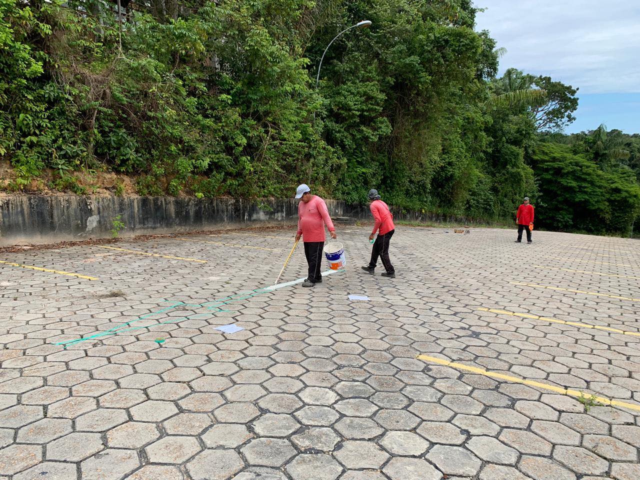Os serviços, realizados durante a situação de pandemia devido à Covid-19, incluíram renovações às sinalizações de vagas e trazem as indicações de sentido de fluxo corretas, facilitando a circulação do tráfego de entrada e saída do estacionamento.