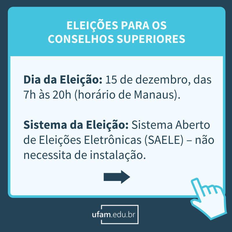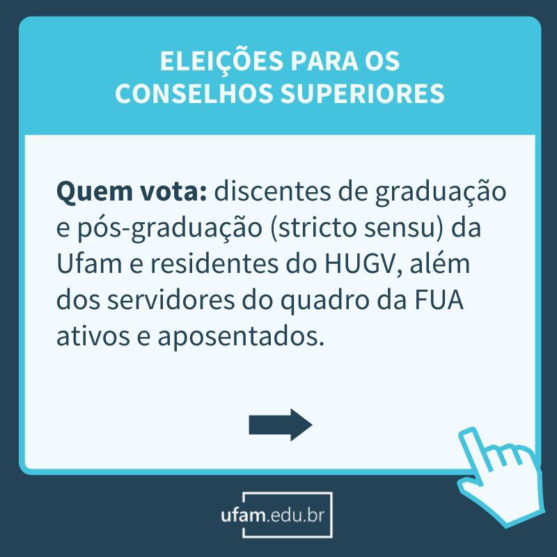 Quem vota: discentes de graduação, pós-graduação (stricto sensu) da UFAM e residentes do HUGV, além dos servidores do quadro da FUA ativos e aposentados.