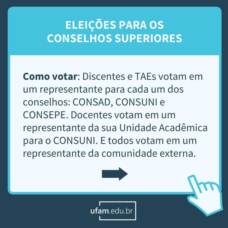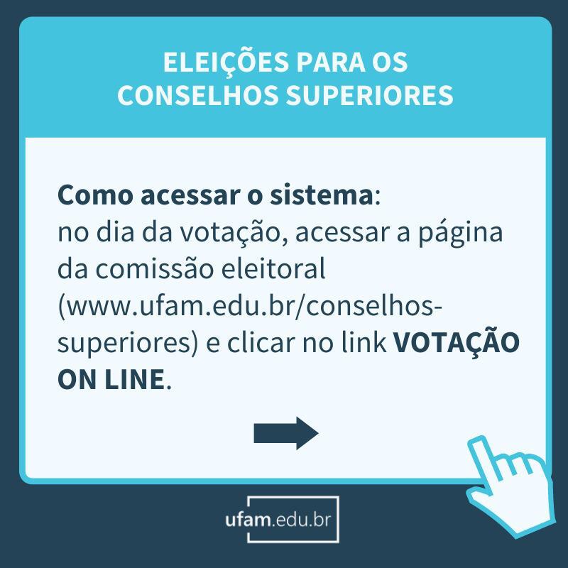 Como acessar o sistema: no dia da votação, acessar a página da comissão eleitoral (https://ufam.edu.br/conselhos-superiores.html) e clicar no link VOTAÇÃO ON LINE. Através de seu CPF, o sistema já encaminha para a categoria que o eleitor pertence (técnico administrativo, docente ou discente) e já irá disponibilizar os links para as votações correspondentes, para o CONSAD, CONSEPE e CONSUNI. Os links estarão disponíveis somente no dia da eleição.