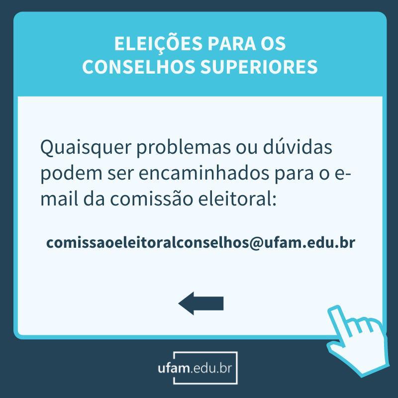 Quaisquer problemas ou dúvidas podem ser encaminhados para o e-mail da comissão eleitoral Este endereço de email está sendo protegido de spambots. Você precisa do JavaScript ativado para vê-lo.