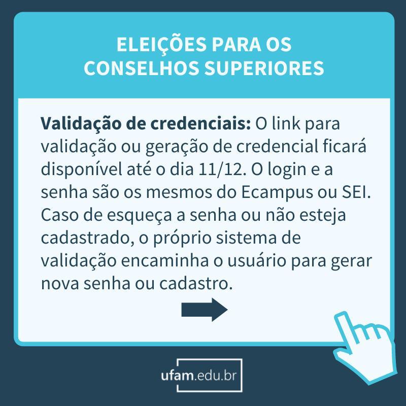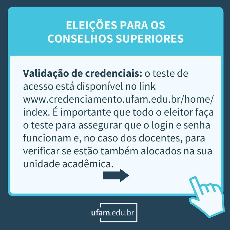 Validação de credenciais: está disponível neste link (https://credenciamento.ufam.edu.br/home/index) o teste de acesso. É importante que todo o eleitor faça o teste para assegurar que o login e senha funcionam e, no caso dos docentes, para verificar se estão também alocados na sua unidade acadêmica. O link para validação ou geração de credencial ficará disponível até o dia 11/12.