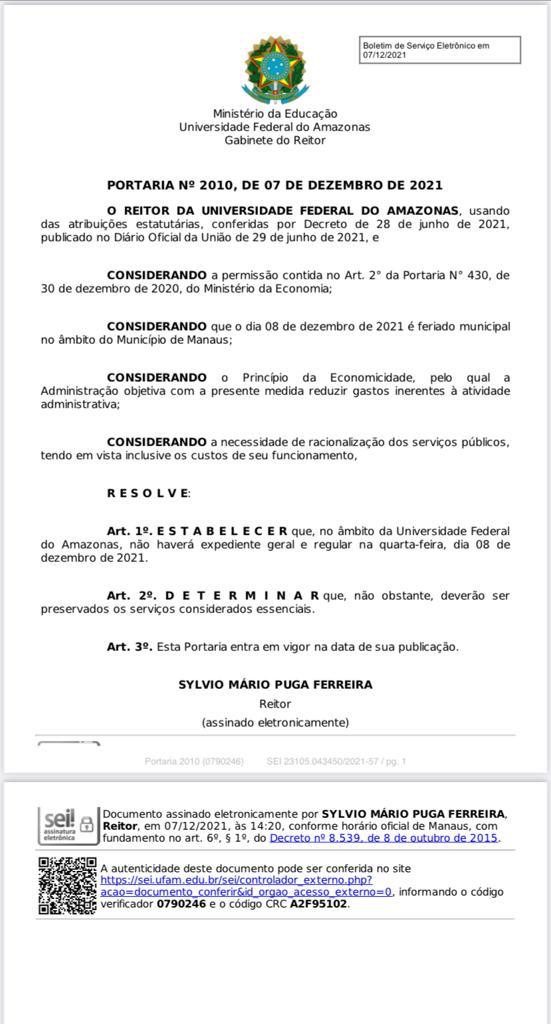 UFAM publica portaria que determina o expediente do dia 8 de dezembro de 2021